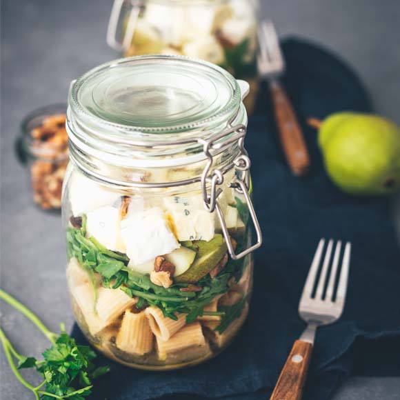 Herfstpastasalade in glas, met peer, walnoten en CAMBOZOLA