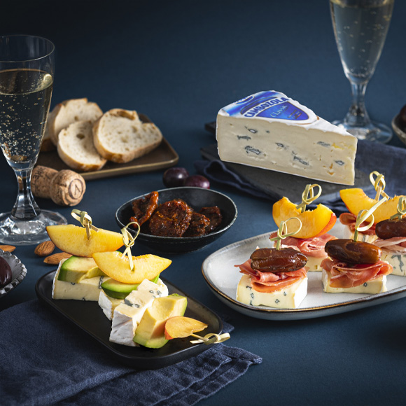 Tipp: Die Zutaten können beliebig gemischt und ausgetauscht werden. Für zwei Personen sind Spieße mit insgesamt 150 g CAMBOZOLA gedacht.