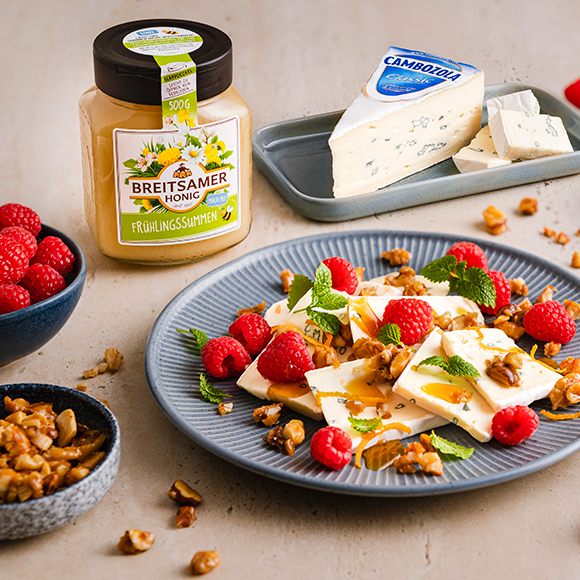 3. Anrichten: CAMBOZOLA in gleichmäßige Scheiben schneiden. Die abgekühlten, karamellisierten Nüsse über die Käsescheiben streuen. Die Reduktion darüber träufeln. Mit Himbeeren, Minze und Orangenabrieb garnieren und sofort servieren.
