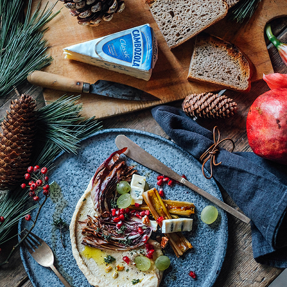 Etwa 2 EL Hummus auf dem Teller verteilen, den gerösteten Radicchio und Lauch darauf anrichten. Den CAMBOZOLA in kleine Stücke schneiden und auf dem warmen Gemüse verteilen. Mit Weintrauben, Granatapfelkernen, Pekannüssen und Thymian verfeinern. Etwas Dressing darüber geben und wer mag, kann Bauernbrot und extra CAMBOZOLA dazu servieren.