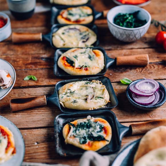 6. Dann zum Raclette servieren. Einfach in die Pfännchen geben, nach Belieben belegen und backen bis der Käse geschmolzen ist.